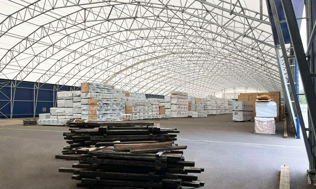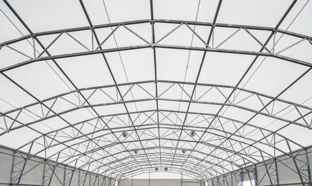 The roof of a PVC hall is typically made of white PVC fabric, which is light-transmitting and provides sufficient natural daylight, reducing the need for artificial lighting.