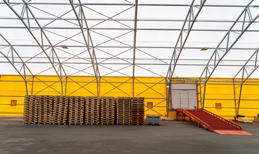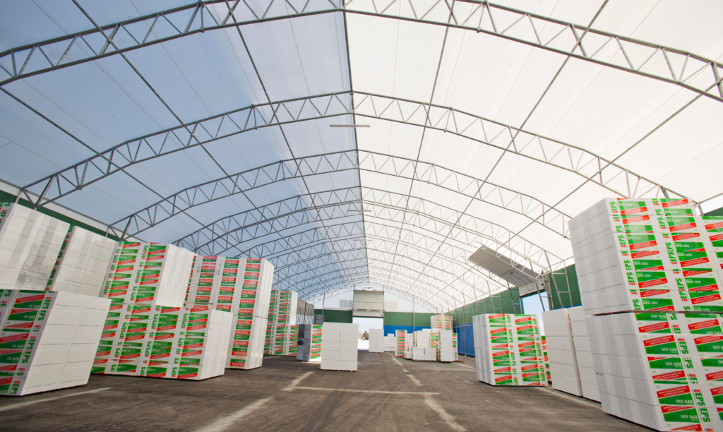 Width is determined by the dimensions of the goods, the direction of storage, the number of rows/racks, the width of aisles, and the type of forklift used (standard or side-loader). For cost efficiency at the chosen capacity, prefer a narrower and longer solution—i.e., the longer the PVC hall, the lower the price per square meter.